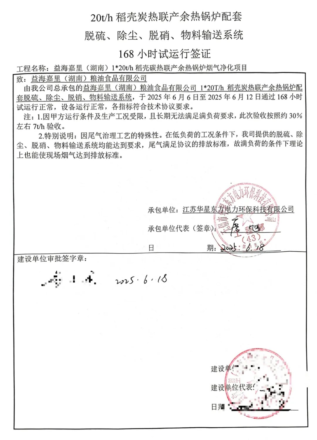 我公司承建的湖南省長(zhǎng)沙市益海嘉里稻殼碳熱聯(lián)產(chǎn)余熱鍋爐煙氣凈化項(xiàng)目于2025年06月12日通過(guò)168小時(shí)試運(yùn)行。 The FGC system of the Yihai Kerry rice-husk carbon heat cogeneration waste heat boiler, Changsha, Hunan, constructed by HEPT, has passed the 168-hour trial operation since June 12th 2025.