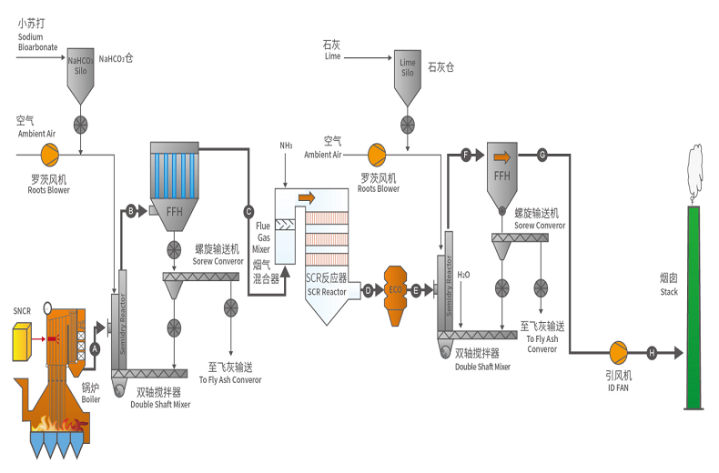 采用SNCR+SDS干法+除塵器+SCR+ECO+干法+布袋除塵器的組合工藝,實(shí)現(xiàn)固體廢棄物焚燒尾氣的超凈排放和煙氣消白。